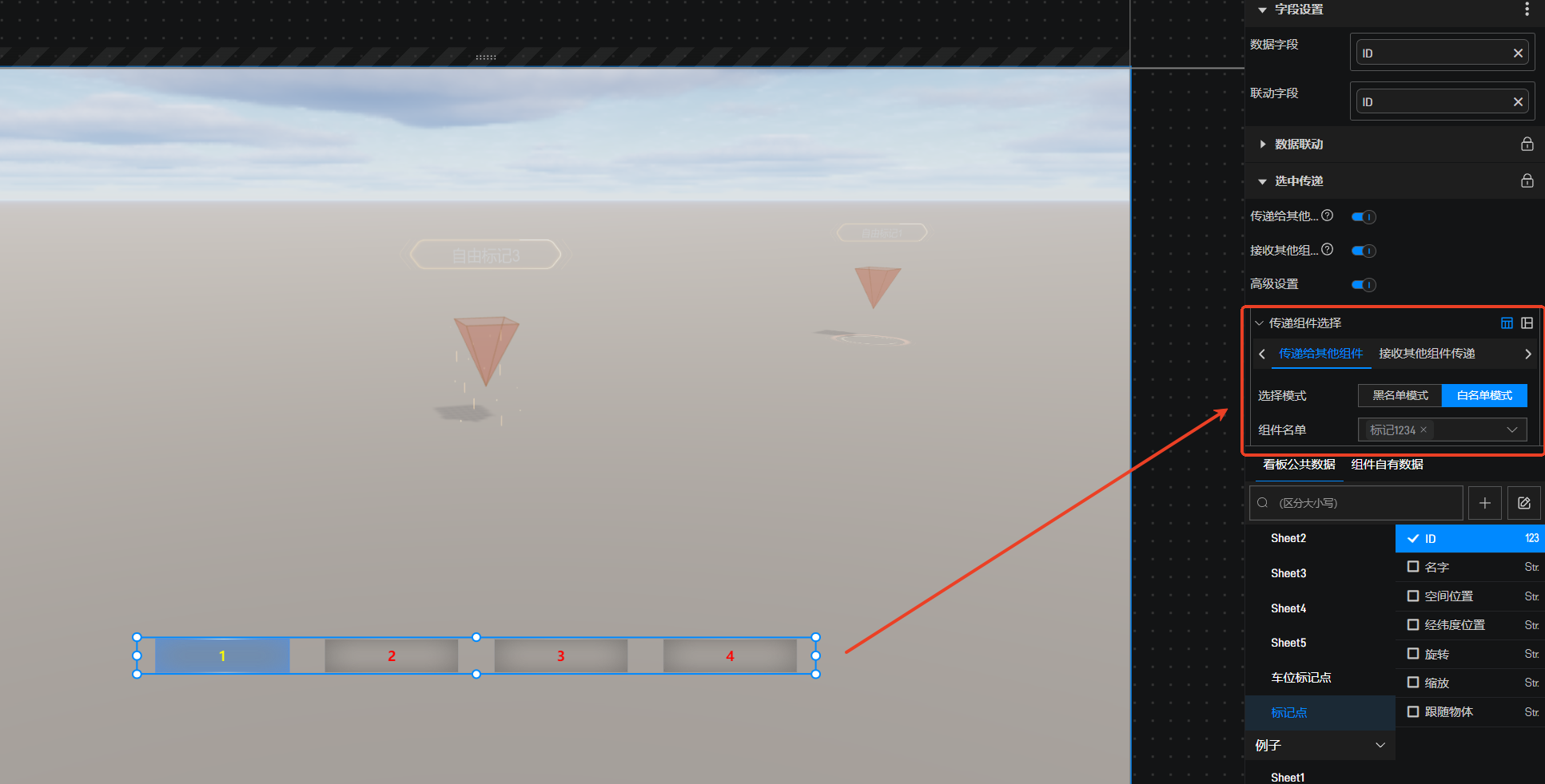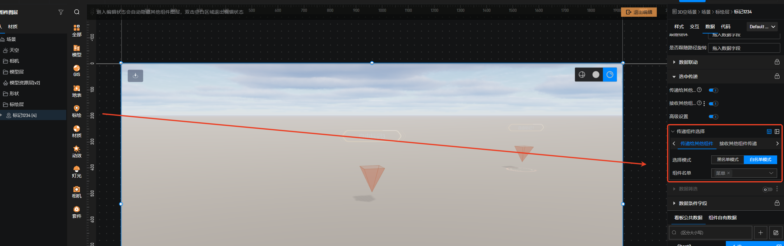 2.横向菜单开启选中传递的传递给其他组件和接收其他组件传递,白名单模式,目标组件均选择对应的标记点组。