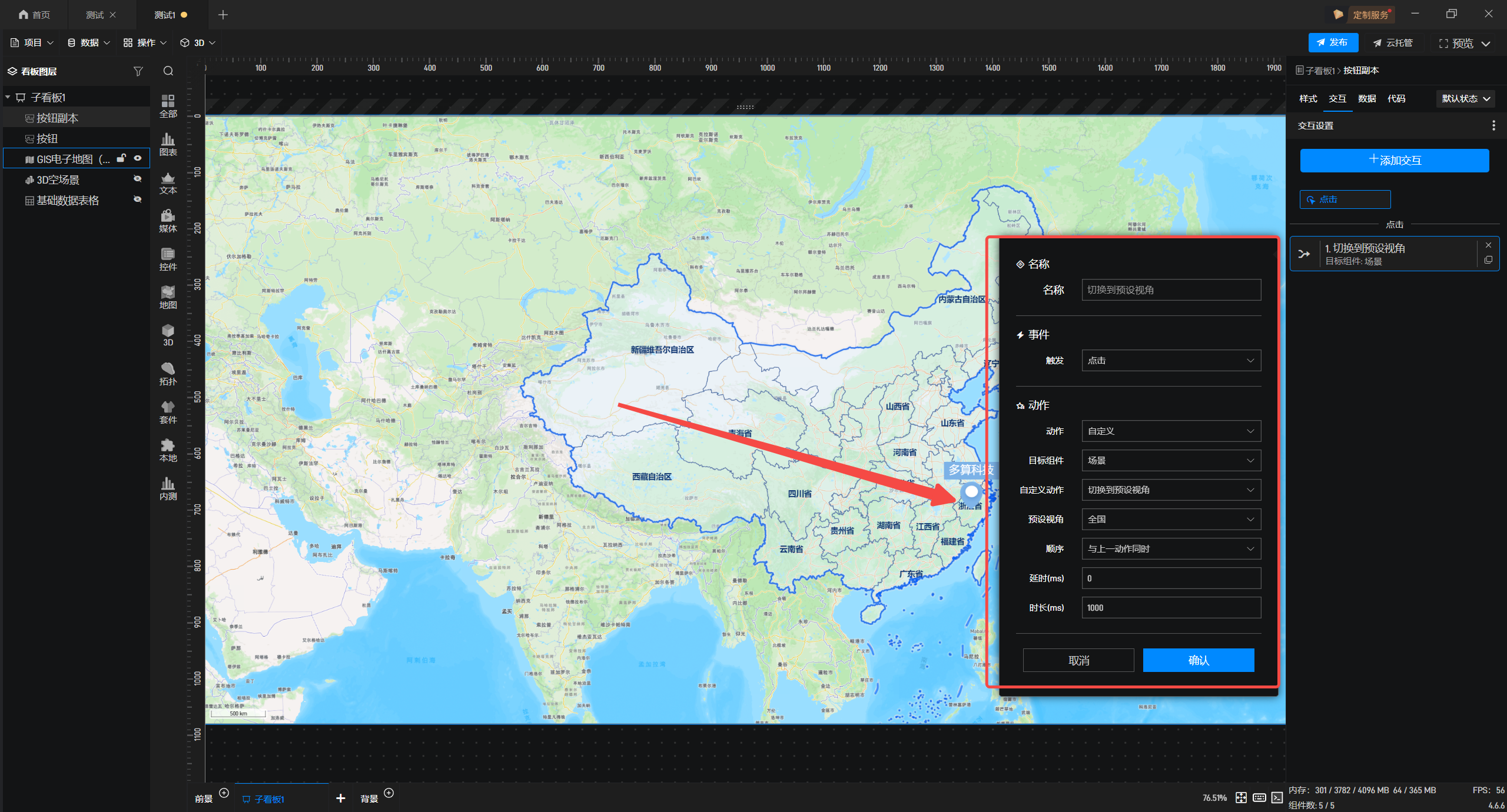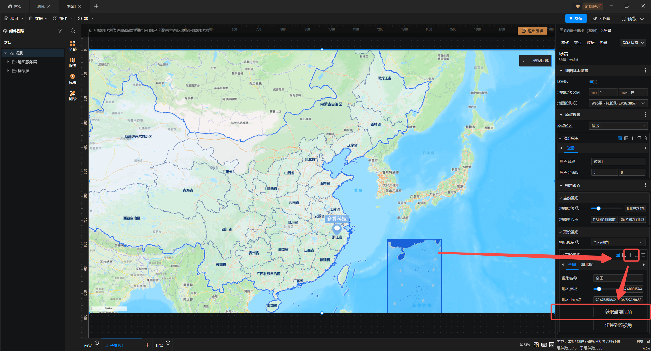 1.双击进入编辑界面,分别添加全国地图和湖北省的预设视角,参考此教程:场景 - 项目制作 - 数字孪生开发教程-可视化大屏制作教程 - 山海鲸可视化