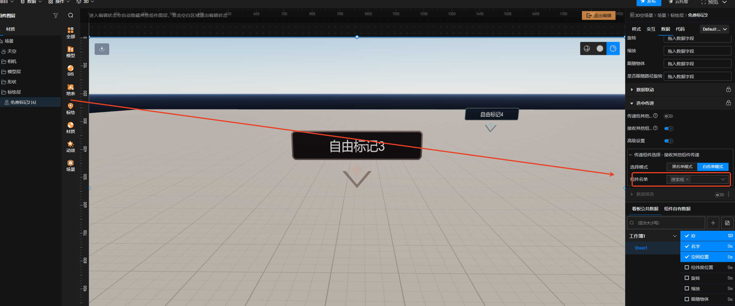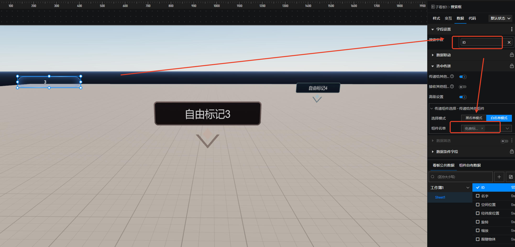 1.添加自由标记点,连接数据,变为数据标记点。参考此教程:标记点概述-项目制作-数字孪生开发教程-可视化大屏制作教程-山海鲸可视化。然后开启选中传递,组件选择搜索框。