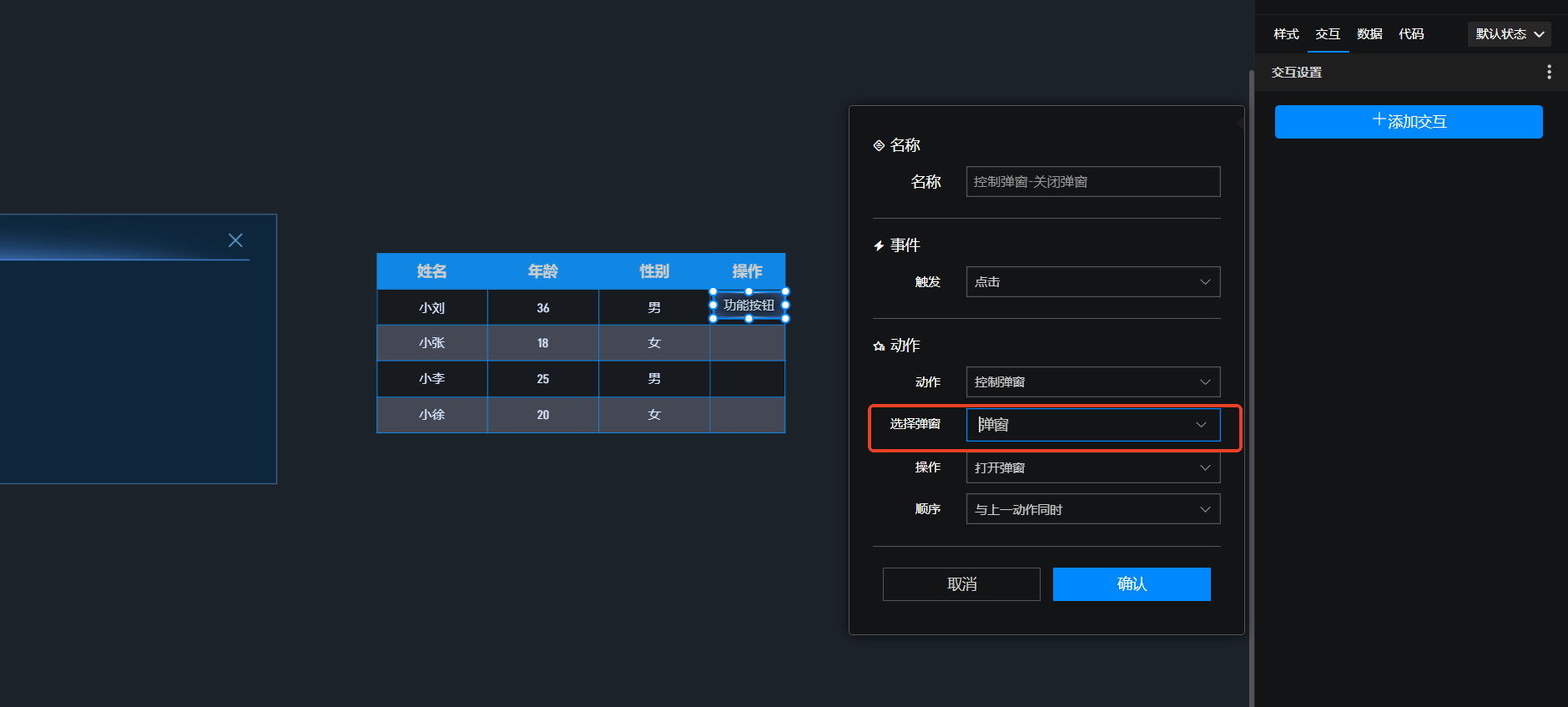 3.最后在按钮上添加触发弹窗弹出的交互即可。
