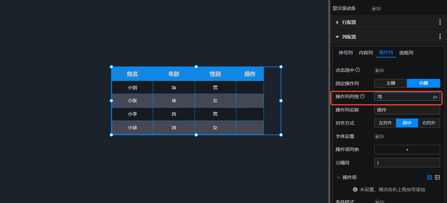 1.在表格的样式设置中添加操作列数值。