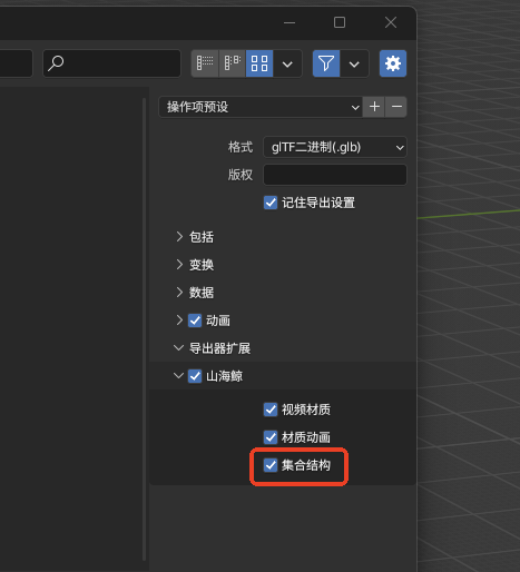 建议将模型文件转为blender适配的格式,在blender内检查好模型层级顺序,使用插件勾选图示中选项导入山海鲸。插件下载地址:免费下载山海鲸可视化+山海鲸报表+山海鲸查看器+山海鲸数据管家,支持各种操作系统。