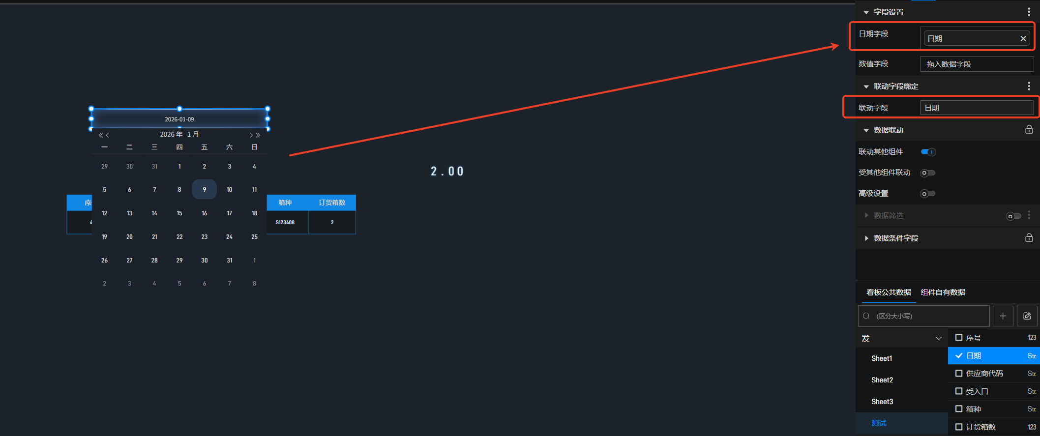 用数据联动来做。添加一个时间选择器组件,勾选数据(注意:联动字段也要填写),开启联动其他组件,然后表格和翻牌器均开启受其他组件联动即可。参考此教程:设置数据联动 - 项目制作 - 数字孪生开发教程-可视化大屏制作教程 - 山海鲸可视化