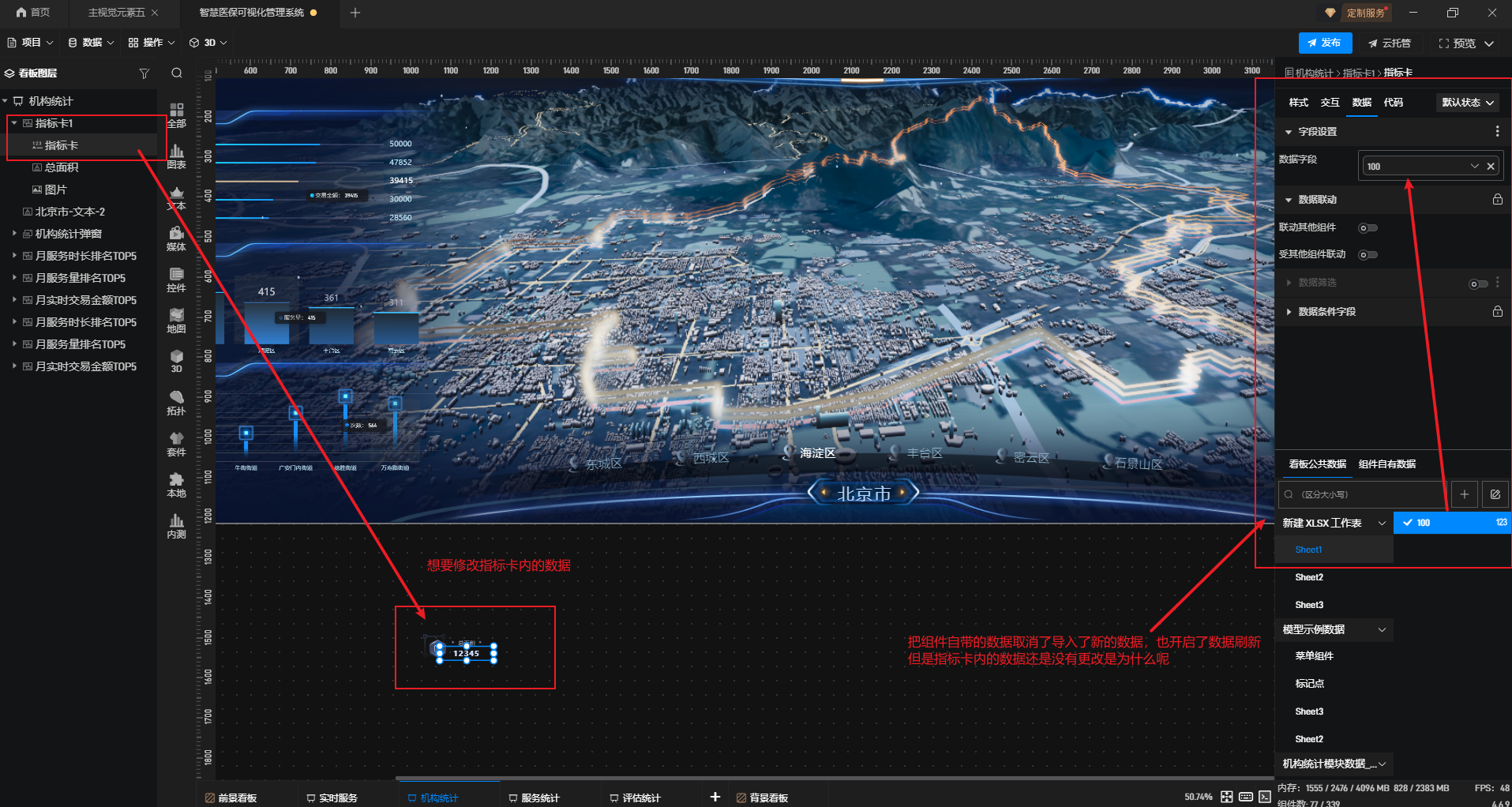检查一下数据是否正常,或者重新启动项目,可能是项目三维太大,组件数据更新不及时。