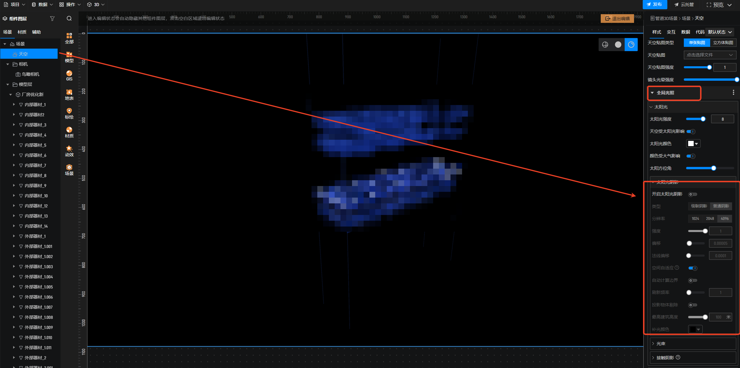 在天空的全局光照里面调整一下太阳光阴影。