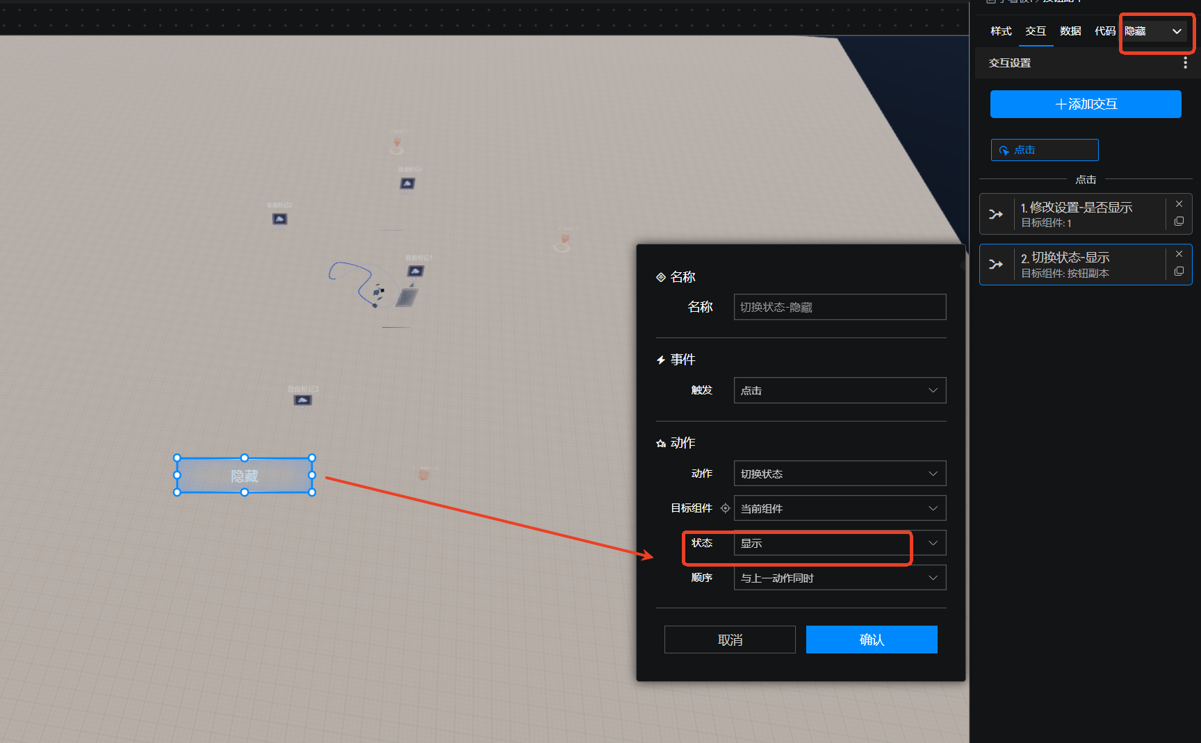 如果想要只使用一个按钮来控制的话,可以在按钮上添加两个状态:显示和隐藏;然后分别在两个状态下设置状态切换的交互即可。