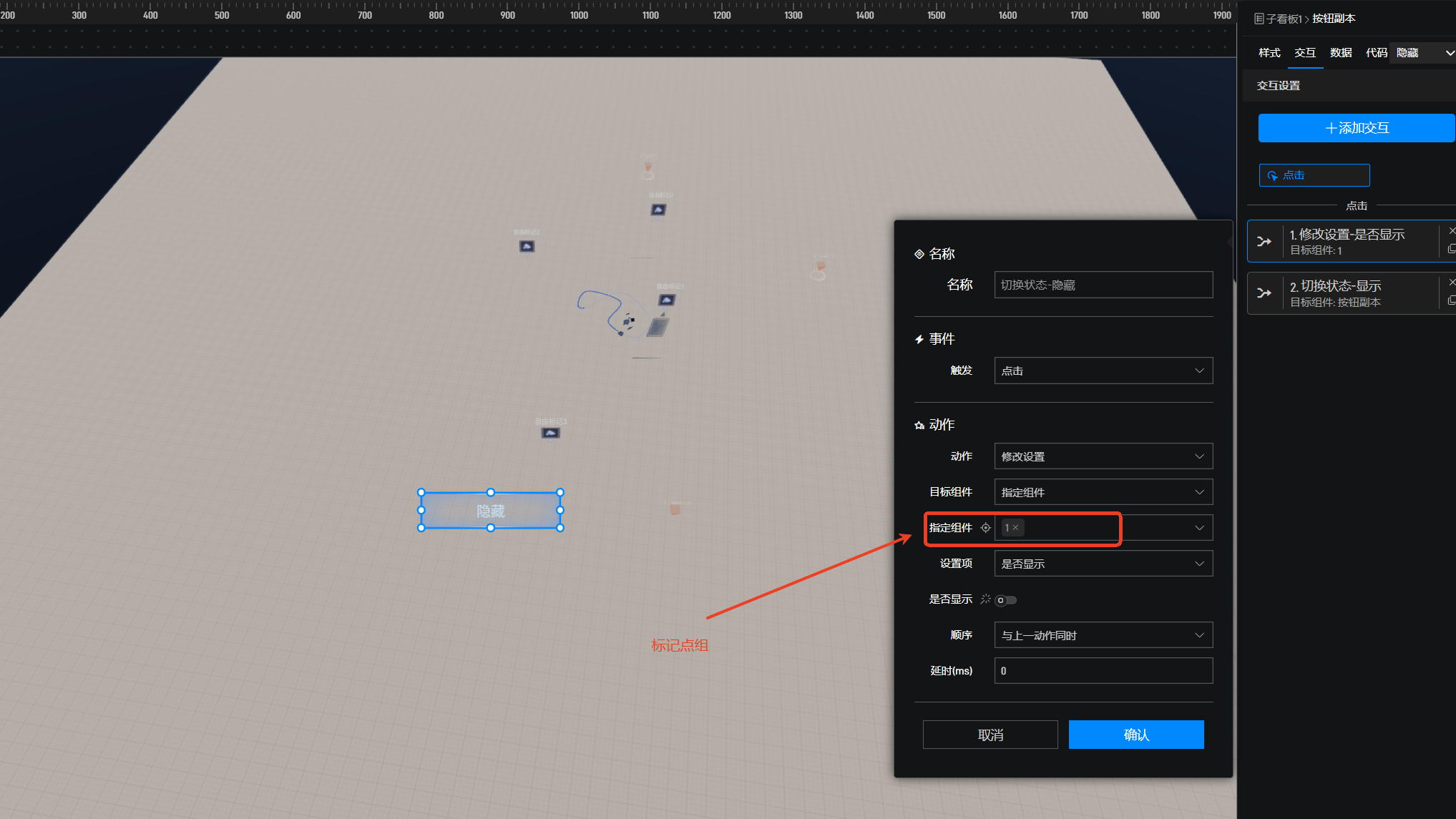 标记点组上不支持使用状态控制整组标记点的显隐。可以直接添加按钮,在按钮上添加修改设置的交互即可。