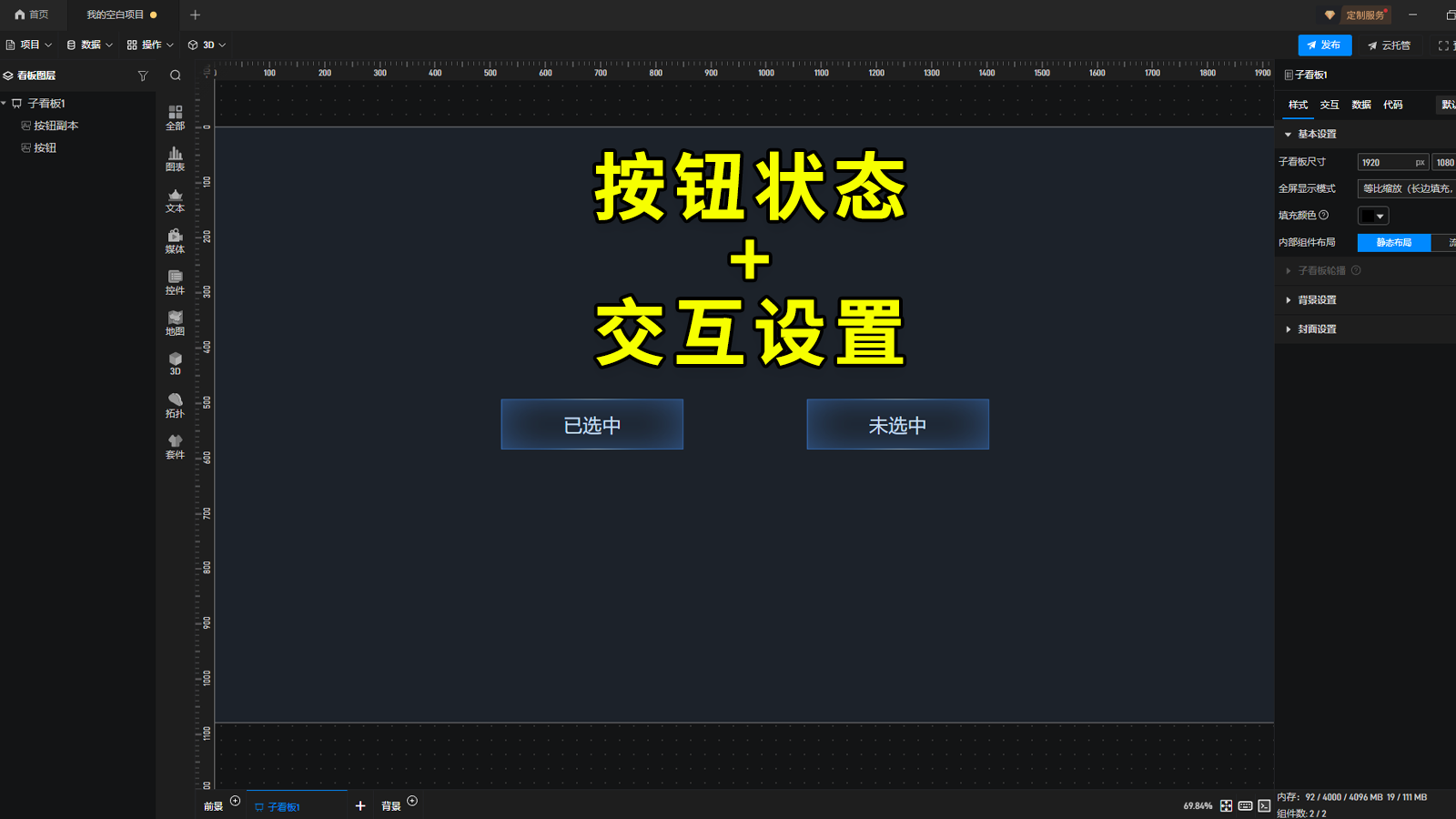 测绘功能是数据可视化、三维场景与大屏交互中的关键能力,可实现距离、面积、坐标等测量与数据输出,提升项目实用性。本文将介绍其使用方法、流程与场景,帮助用户快速掌握并增强项目数据交互能力。1.添加“3D空 场景”组件至项目中。 接着添加“按钮”组件至项目中。2.选中按钮组件,添加“交互”,触发“点击”事件,执行“自定义”动作,目标组件为“场景”,可以按需选择“自定义动作”。展示效果如下:注意: 测绘结果由交互实时生成,仅为临时展示,刷新项目后将自动清空。...