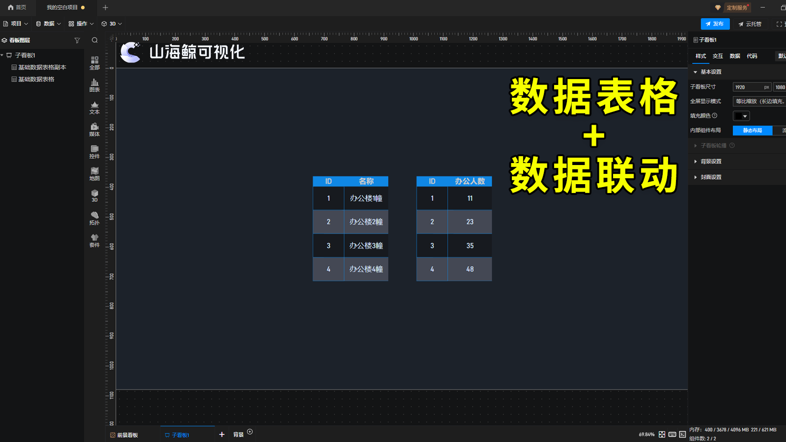 在制作数据可视化项目时,我们可能会需要两个“数据表格”组件之间存在联动效果,下面我们就来看一下,该如何设置两个 “数据表格”组件之间的联动。1. 首先,在项目中添加两个“数据表格”组件。2. 接 着为两个“数据表格”组件添加数据字段,需要保证二者都有至少一列数据能够互相匹配。3. 选中其中一个组件,开启“联动其他组件”。4. 另一个组件开启“受其他组件联动”。最终效果如下图所示:...